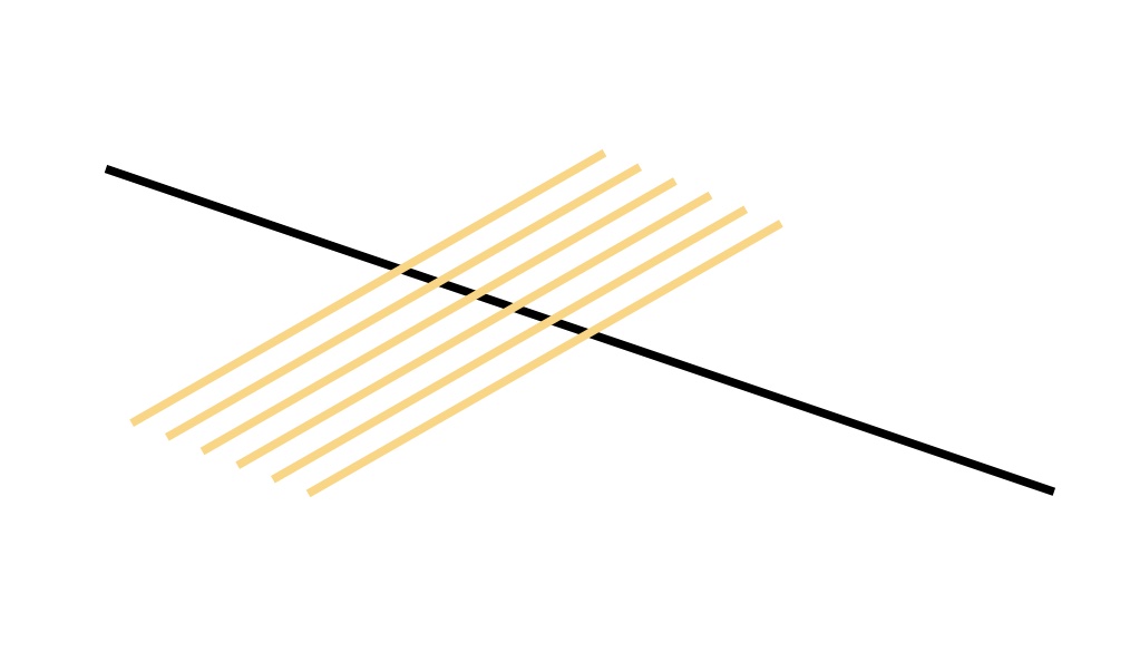 There are several possible ways to extend the bowed-string simulation model to allow for a finite-width bow. The model used here is based on one developed by Roland Pitteroff [1]. We assume some number of separate, discrete “bow-hairs”, spread over a chosen total width as sketched in Fig. 1. These “hairs” are not assumed to be rigid: instead, measured behaviour of individual strands of horsehair is used to deduce an approximate model consisting of a parallel spring-dashpot combination. This model is expressed in terms of values per unit width across the bow by assuming the total number of “active” hairs in potential contact with the string to be 50, representing a single layer of hairs out of the total of 200 or so for a typical violin bow. The properties of each “hair” in the discrete model are then deduced by subdividing the total bow width into the chosen number. The details of all this can be found in reference [2].