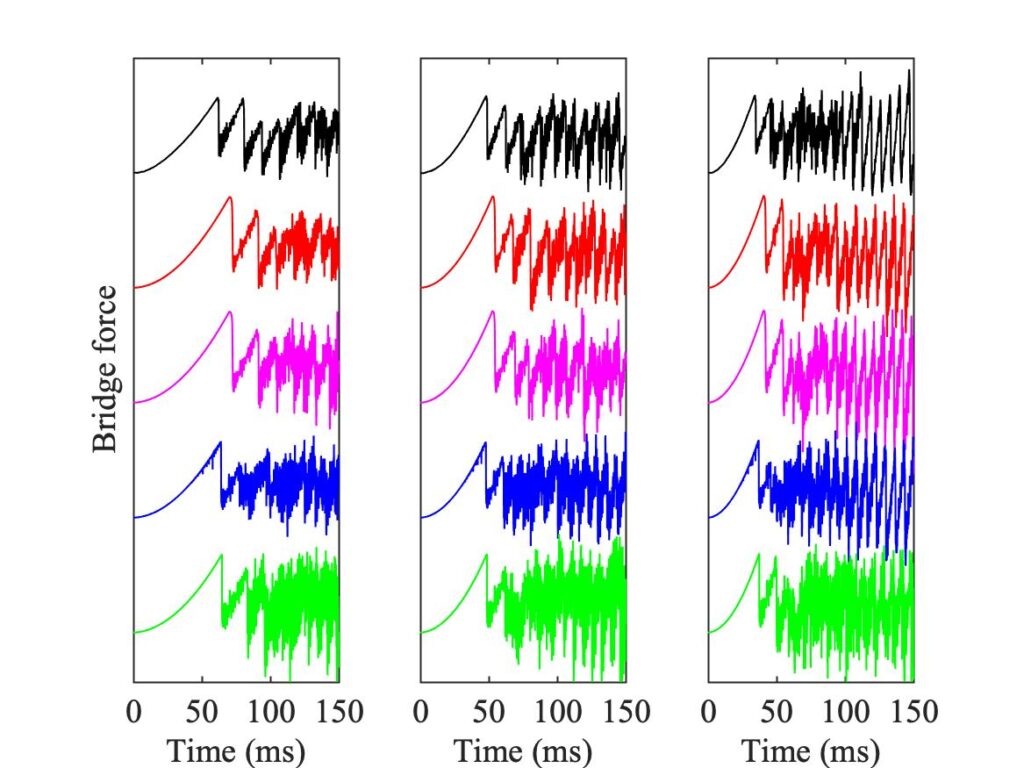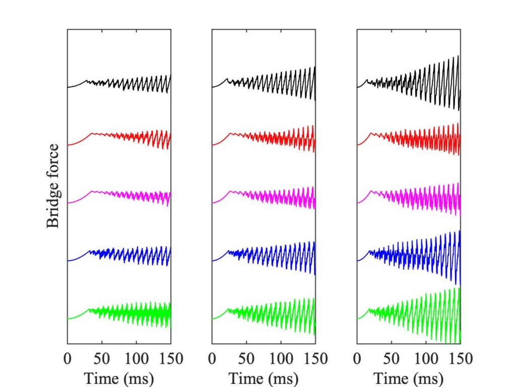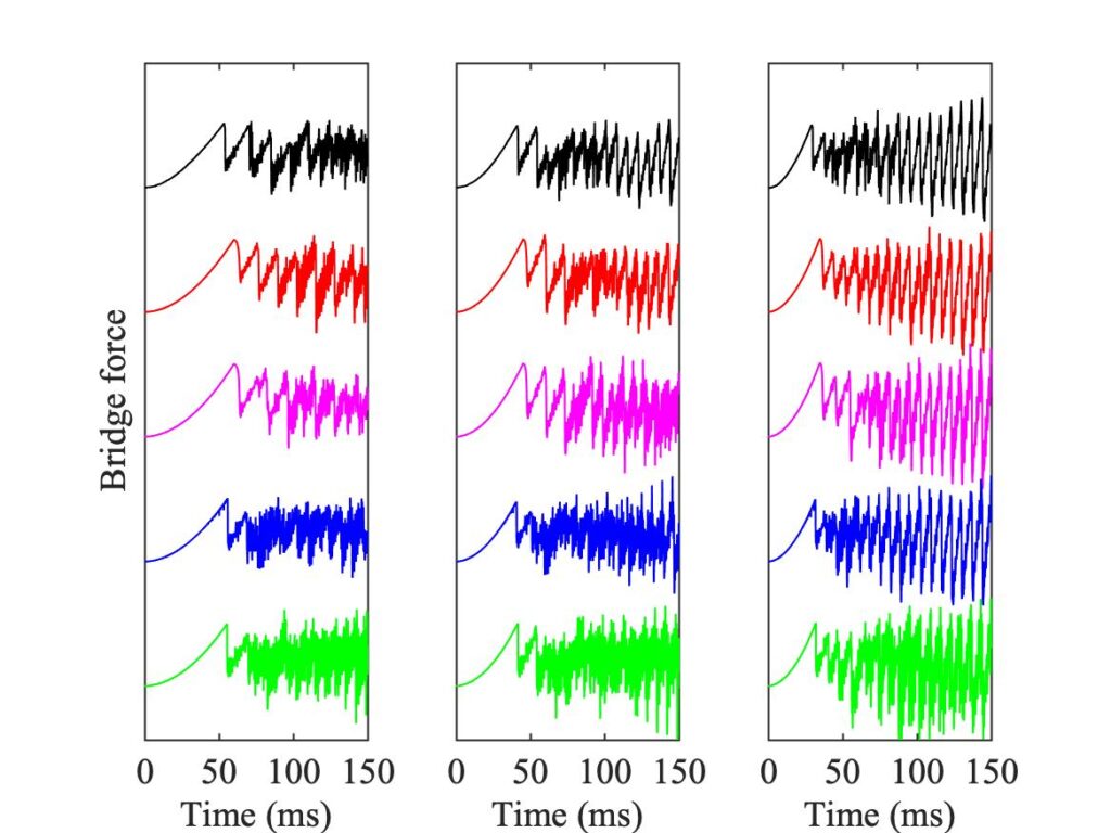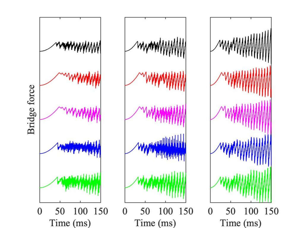 To see a little of what lies behind these Guettler plots, all three panels of Fig. 3 are annotated with a grid of green squares, marking cases that are examined in more detail in Figs. 4—7. Each of these figures corresponds to one row of the green squares, with three panels corresponding to the left, middle and right square of the row. Each individual panel shows 5 bridge-force waveforms. At the top in black is the measurement, corresponding to the top panel of Fig. 3. In red is the finite-width simulation using the original thermal model, and below it in magenta is the corresponding point-bow simulation. In blue is the finite-width simulation using the enhanced thermal model, and in green the corresponding point-bow simulation.