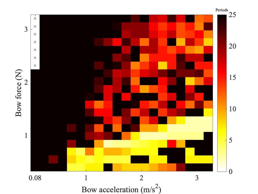 We can illustrate some typical results of this model. The first step is to see what happens when a single-point model turns into ae finite-width model. Figure 2 shows a succession of simulated Guettler diagrams, all for bow position $\beta$ = 0.18 and computed using the enhanced thermal model. The top left panel is a repeat of the point bow result shown earlier. The remaining panels all show a “bow” of width 10 mm, with successively 2, 3, 4, 5 and 6 “hairs” distributed within that width. For 2 hairs, the torsional wave delay across the bow is more than one sample, so the “fudge” is not needed. But for all the other cases this is not the case.